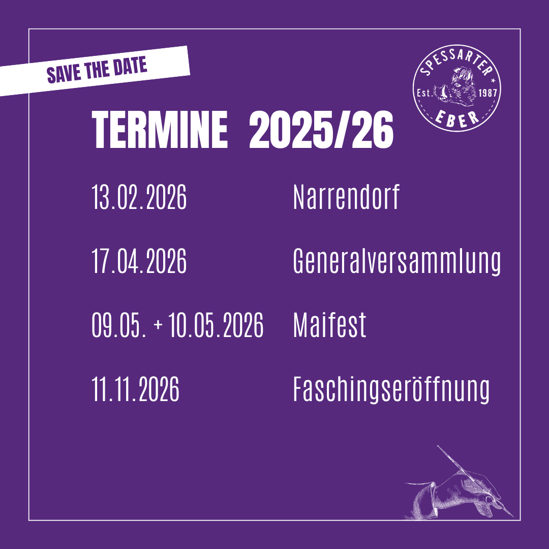 …dass du uns hier besuchst! Ob du schon ein Vollblut-Eber oder ganz neu auf dieser Seite bist, hier erfährst du alles von der Entstehung unseres Vereins bis hin zu den aktuellsten Terminen. Du hast wie wir Konfetti im Blut? Schau dich um, erlebe uns live und hab Spaß mit den Spessarter Ebern!